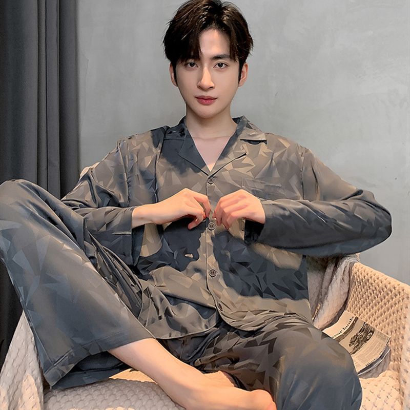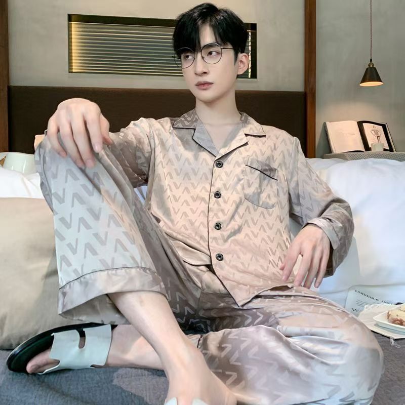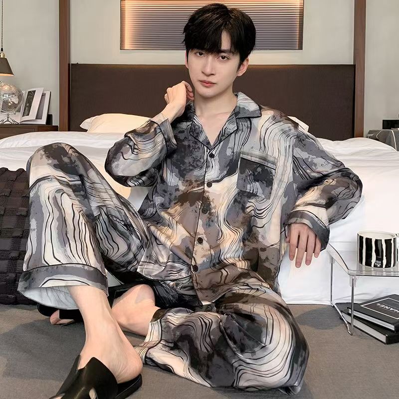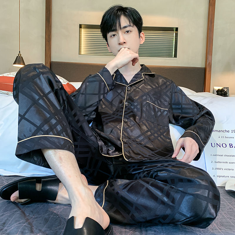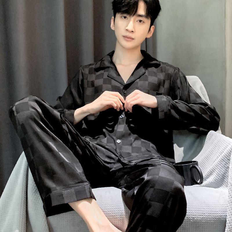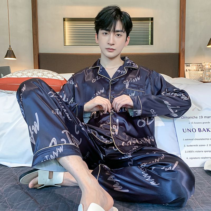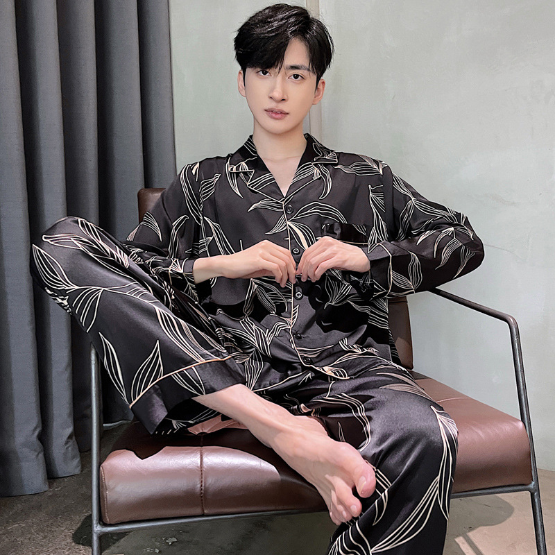 Ice silk long sleeved pajamas for men and men simulated silk plus size home suit set