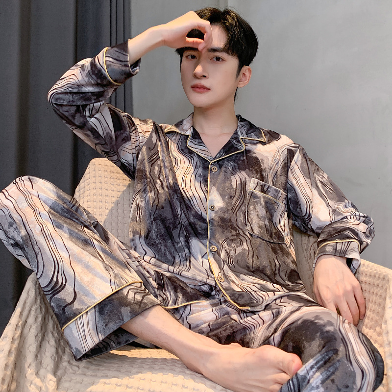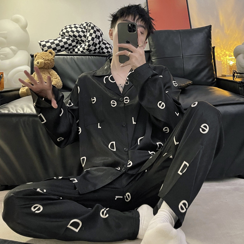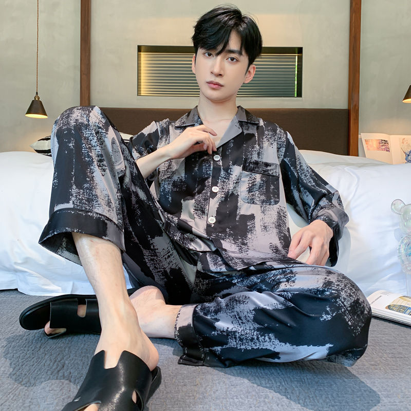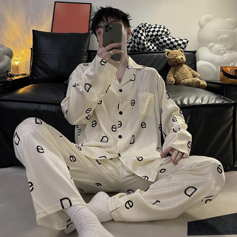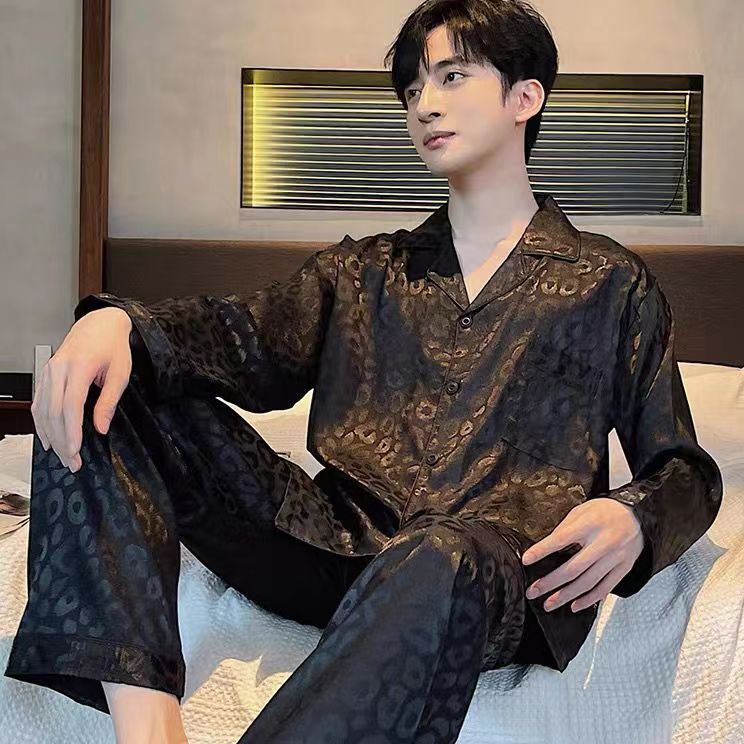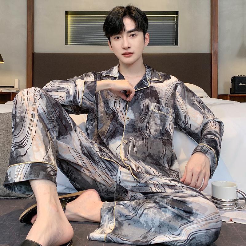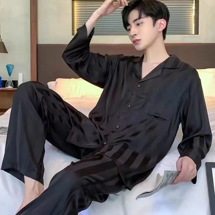 Ice silk long sleeved pajamas for men and men simulated silk plus size home suit set